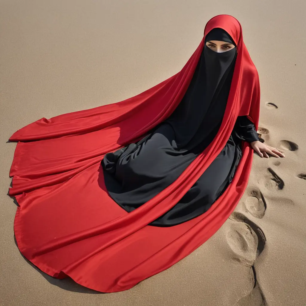 صورة أمامية لمنقبة بنققاب ساتان أحمر ذو لمعة طويل مشدود وخمار أحمر ساتان طويل مشدود ذو لمعة يداها لا تظهر نهائياً في الصورة مستلقية على بطنها على الشاطئ يوجد شريط لاصق عريض جدا يلف حول الخمار من الوسط وهناك شريط لاصق عريض آخر يلف على النقاب من الوسط