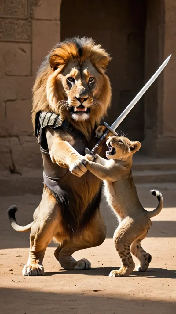 صورة للأسد يحارب بالسيف معنص الصورةنسخصورة للأسد يحارب بالسيف مع إبنه (شبل) للمحاولة تعليمه للفنون الحرب أبعاد الصورةعمودي الموديل المستخدم SDXL العرض576 الارتفاع1024 تاريخ الإنشاء06/10/2024 التطبيق المستخدم مولّد الصور تحميل الدقة الكاملةتعديل الصورةولّد صورة مشابهة0