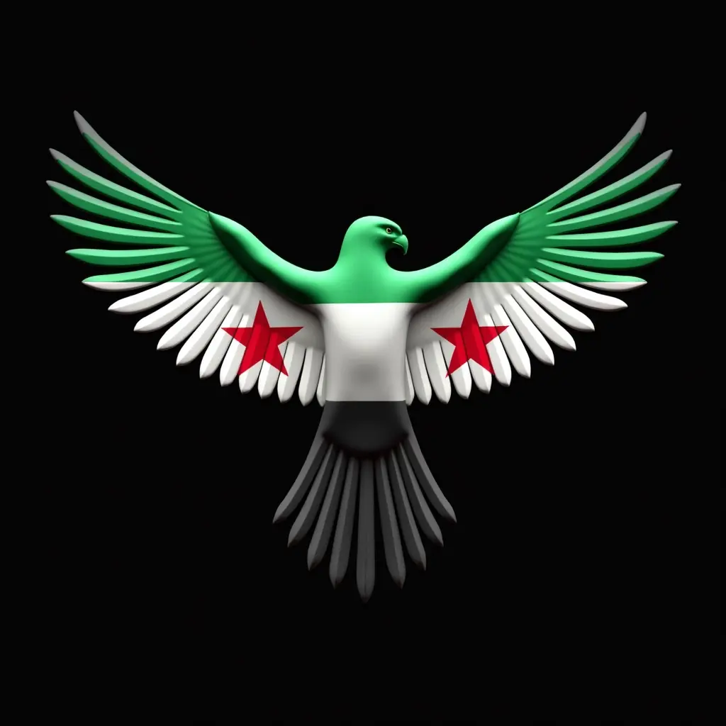 اصنع لي صورة طائر الشاهين المفترس مع علم الثورة السورية يبدو كشعار العلم اخضر ابيض اسود مع فقط ثلاثه نجمات باللون الاحمر بدقه عالية مدموج مع طائر الشاهين مفرود الاجنحه مع خلفيه سوداء بتقنيه 3D