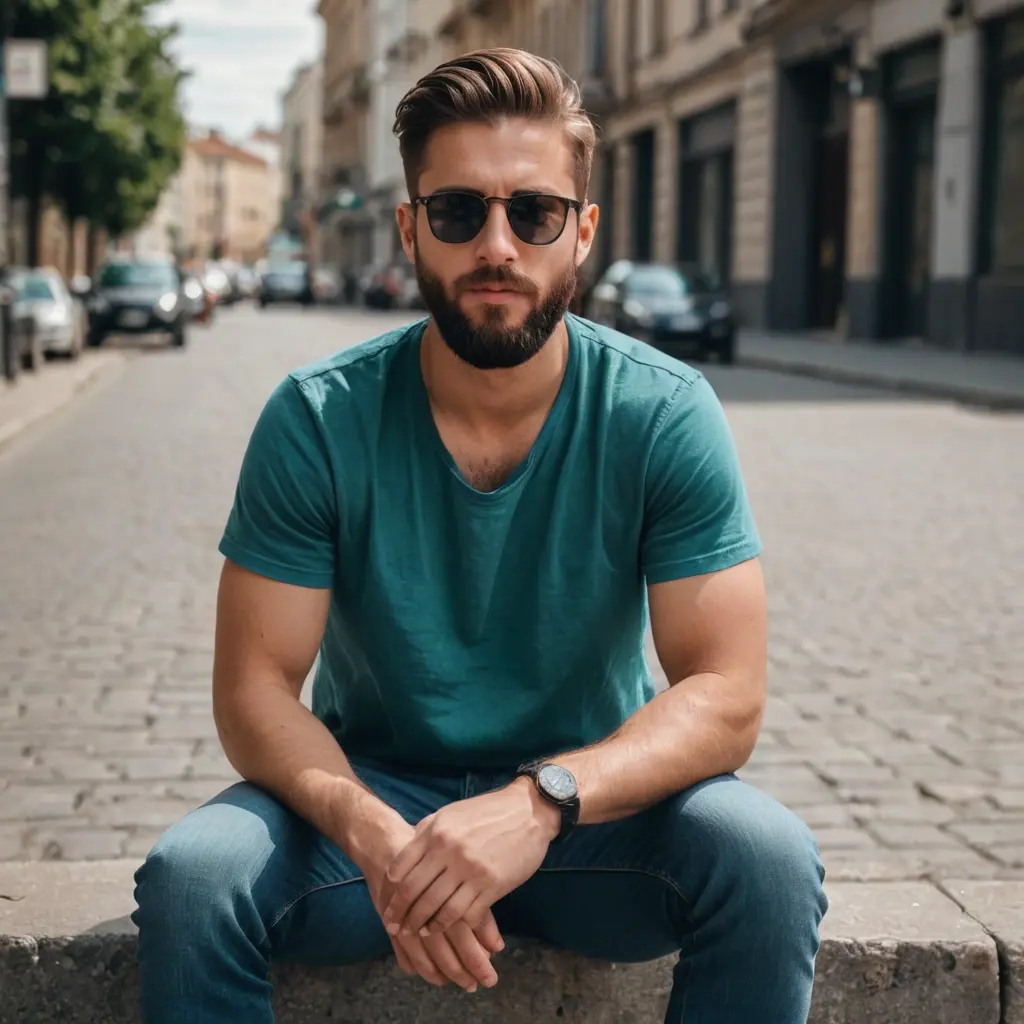 شاب وسيم بلحية لابس نظارة شمسية يجلس في الشارع