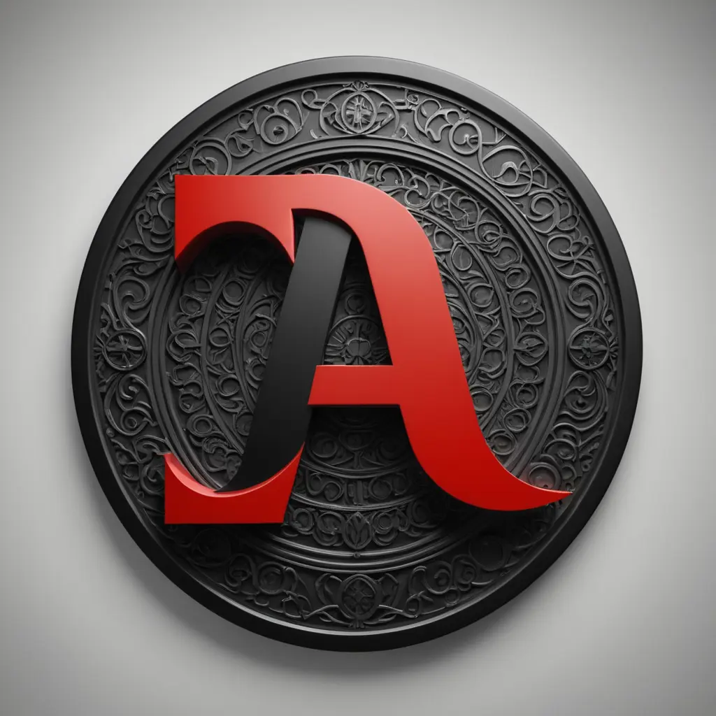 حرف A كبير بالوسط مزخرف زخرفه حديثه والخلفيه نصف اسود ونصف احمر ومكتوب علي الرضا 77 يالانكليزي تحت وبقع ضوئيه وشعار دائري