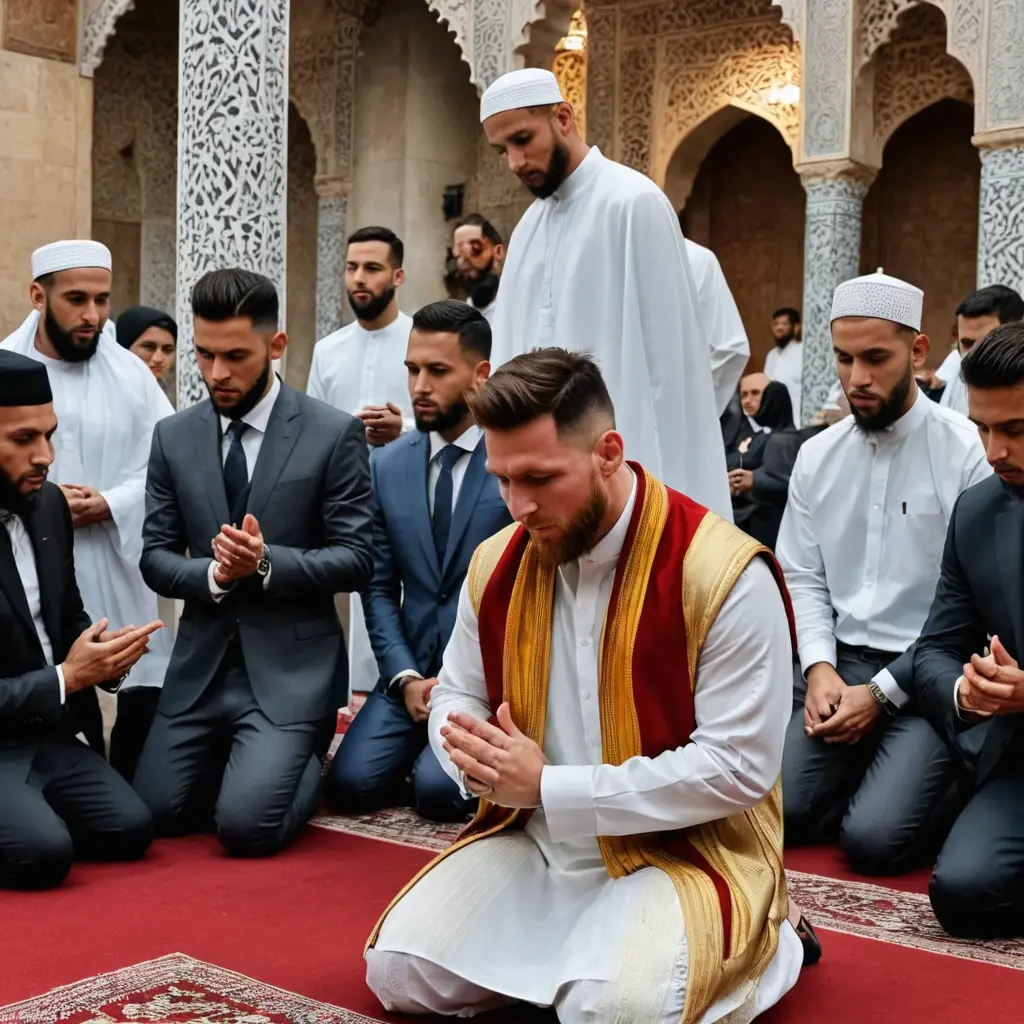 ميسي امام مسجد و يصلي مع الناس إماما و رونالدو و نيمار و امبابي يصلون ورائه و هم جميعا يلبسون الزي الاسلامي مع