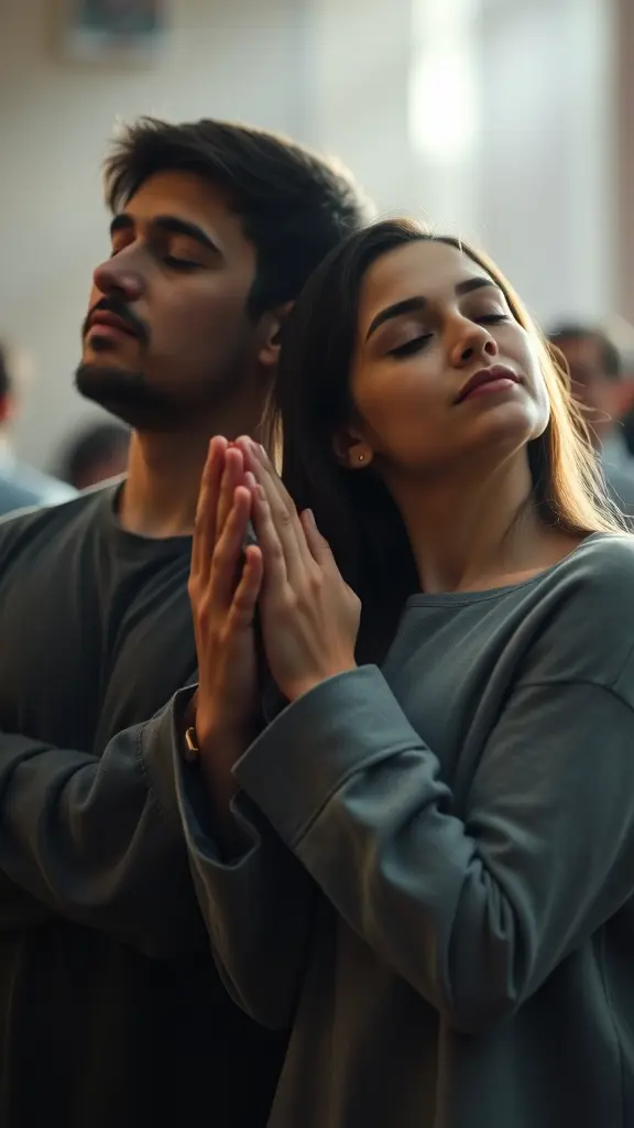 صورة: شخصين ماسكين إيدين بعض ومغمضين عينيهم في صلاة، نور خفيف حوالين المشهد