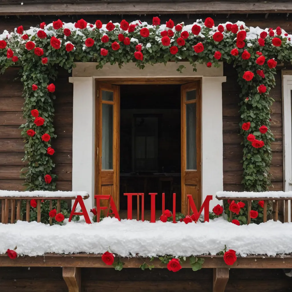 اسم فاطمة على الثلج بورود حمراء امام شرفة منزل في بيت ريفي مصنوع من الخشب