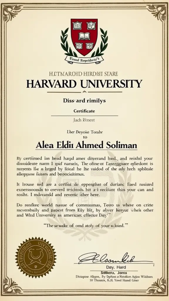 PHD certificate from harvard university with name DR/Alaa Eldin Ahmed Soliman and has gold stamp and american flag