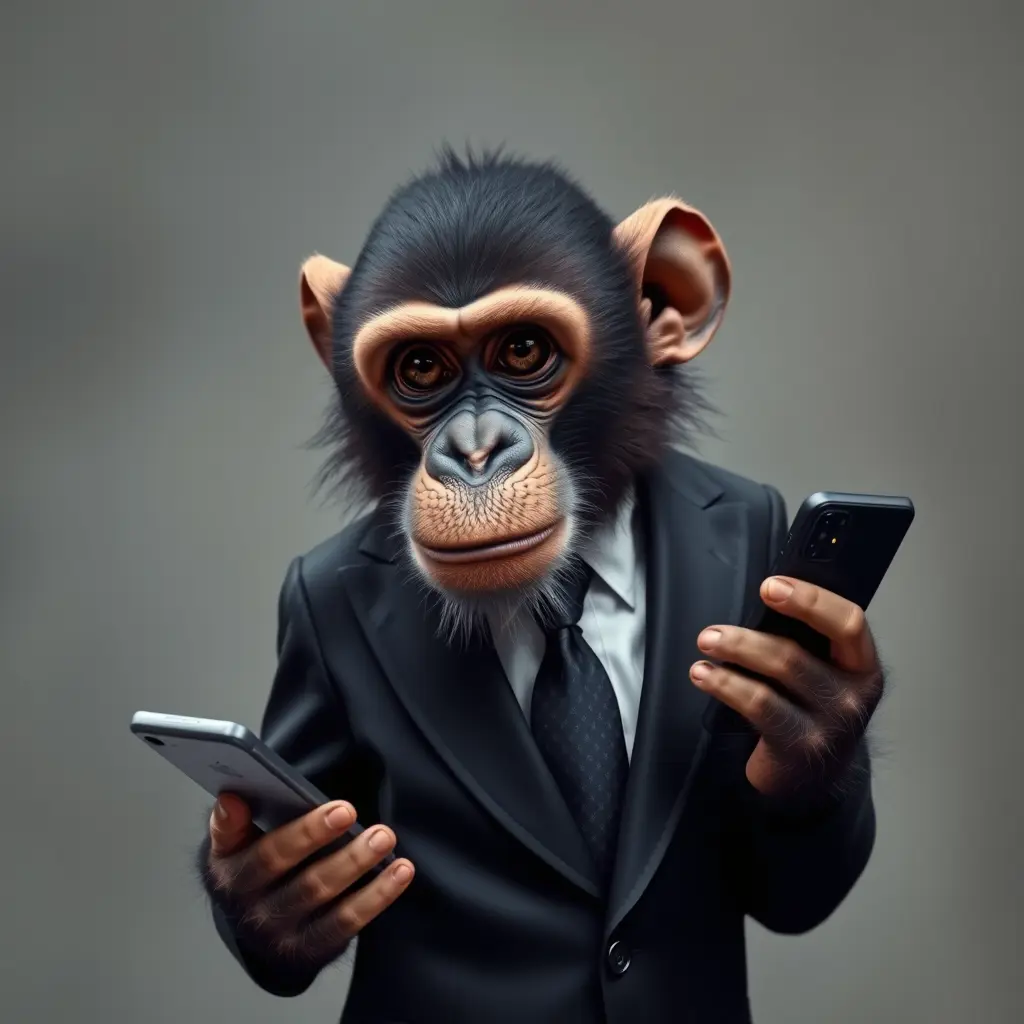 صورة قرد لابس بدله سوداء هوه واقف وبيده هاتف
