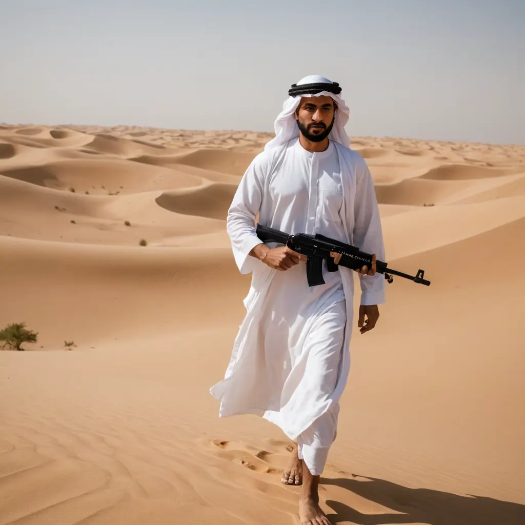 رجل يرتدي ملابس عربية ويحمل سلاح في الصحراء