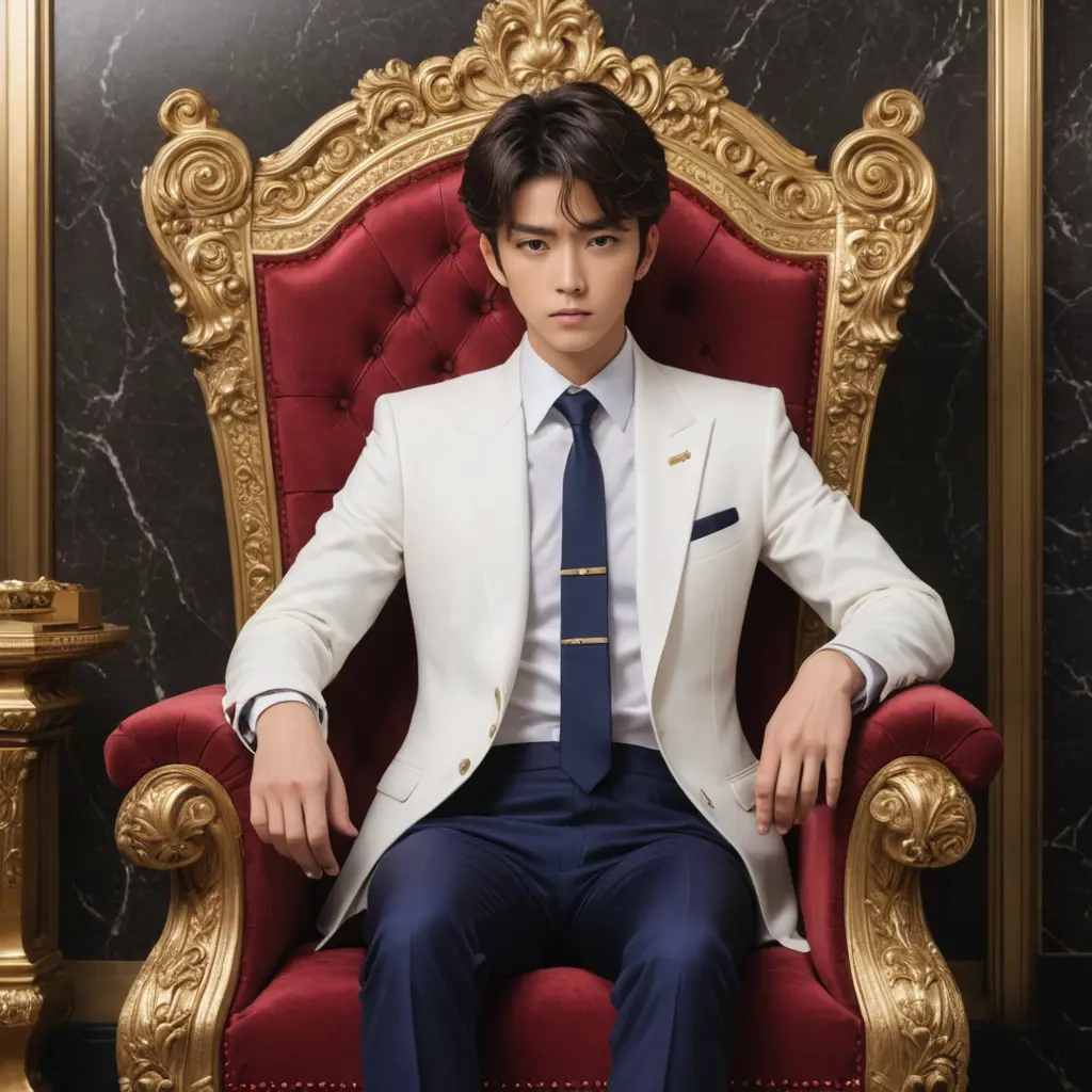 سينشي كودو الولد الانمي علي كرسي العرش في صورة فخمة