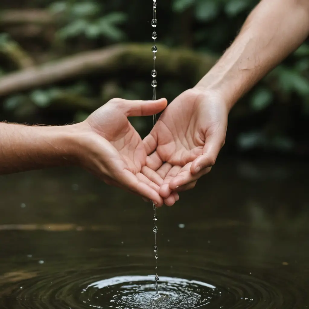 الصورة تظهر يدين بشريتين، مرسومتين أو ملتقطتين في لحظة دقيقة. اليدان ممدودتان، وكأنهما تحاولان الإمساك بقطرة ماء شفافة تتدلى بينهما. تعكس القطرة ضوءًا خفيفًا، مما يضيف لمسة سحرية للصورة. يمكن أن يعطي المشهد شعورًا بالهدوء والتركيز، حيث يبرز جمال اللحظة البسيطة، ويعكس العلاقة بين الإنسان والطبيعة. الخلفية قد تكون ضبابية أو محايدة، مما يتيح للعين التركيز على اليدين وقطرة الماء.