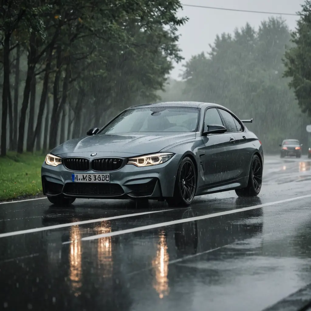 سيارة bmw تحت المطر وتحت الاجواء الهادئه