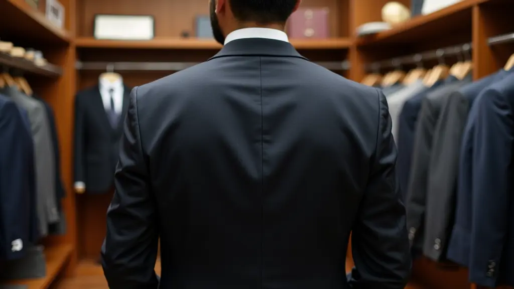 شخص يرتدي بدله رسميه في محل ملابس رسميه من الداخل مكتوب باسم Ali Shaaban