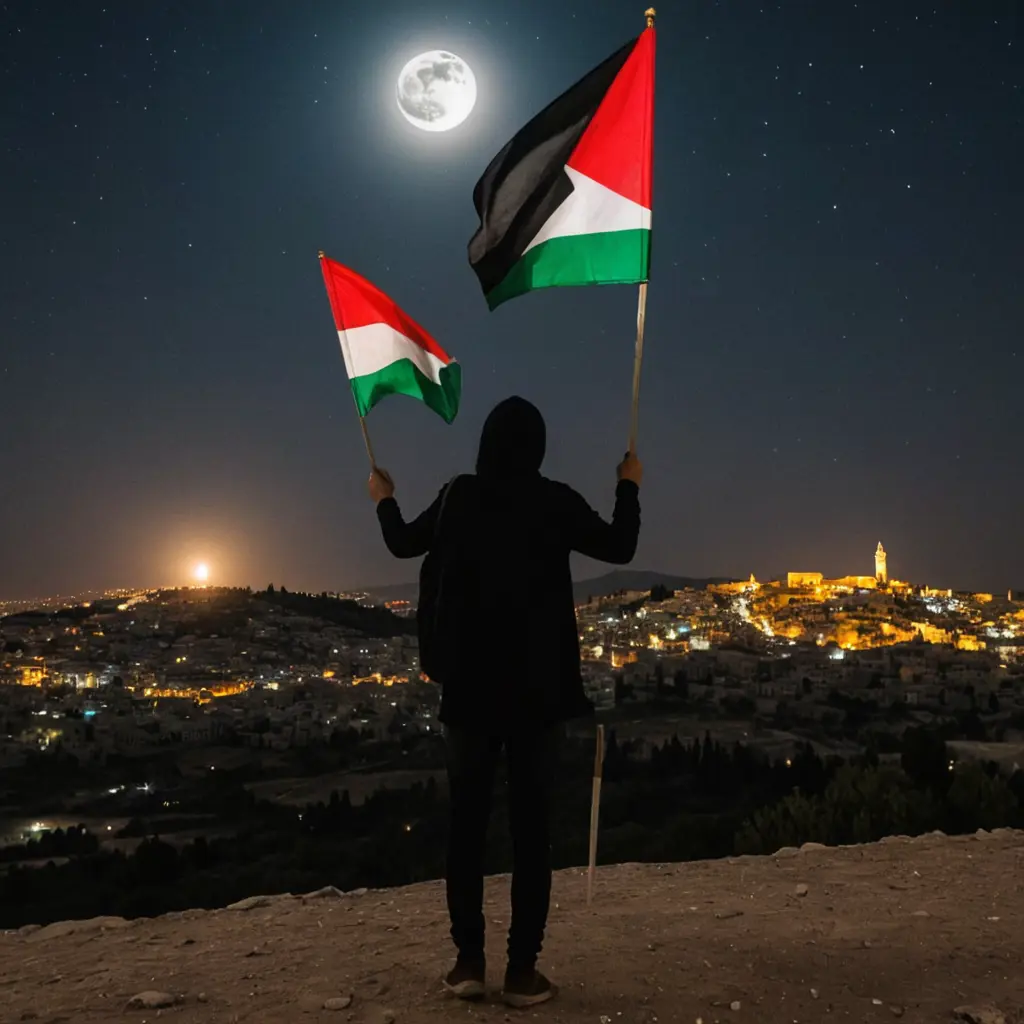 شاب يحمل علم فلسطين ملثم  لليل مضيا بلقمر وللنجوم  في عام 2050 قري قبت الصخرة ويرتدي جمدانه فلسطينية فوق جبل لبسه فلسطيني وشعر طويل ولليد الآخر يحمل علم سوريا