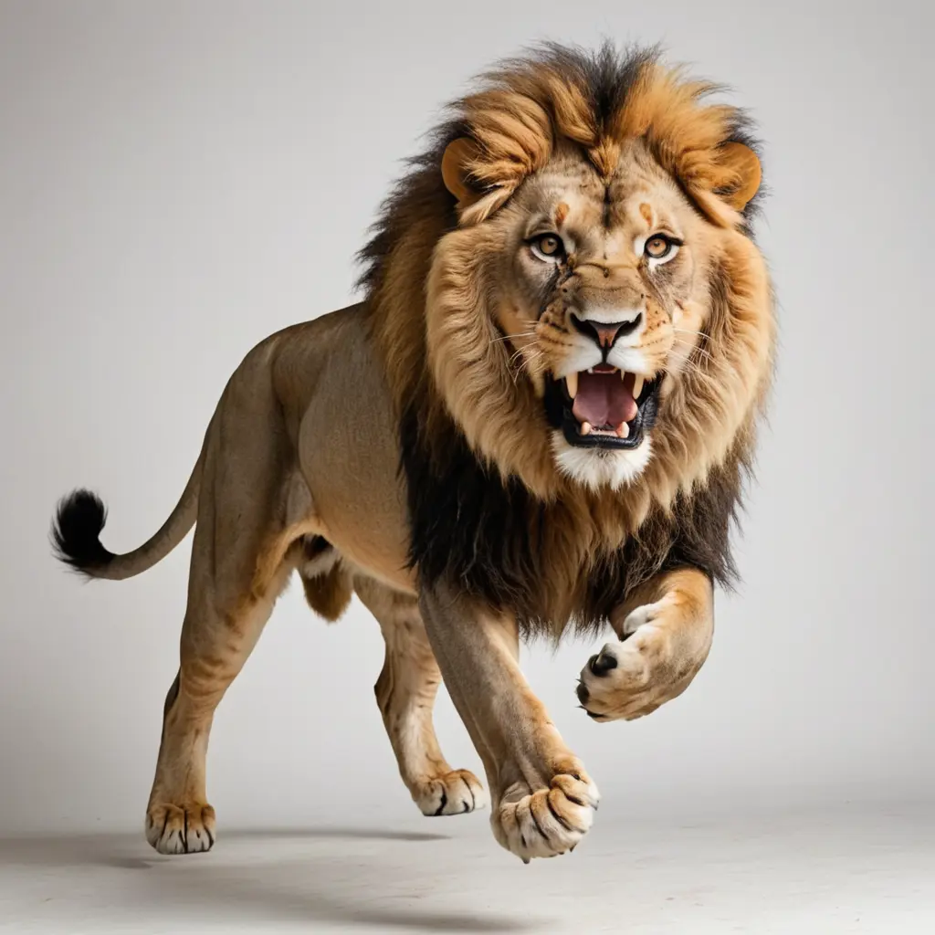 صورة اسد حقيقية يقفز في إتجاهي ينزل من الاعلى الى الاسفل .خلفية بيضاء.  أسد حقيقي. واقعي. يقفز في إتجاهي انا في الاسفل. لقطة امامية . تنبض بالحياة . الاسد مرتفع عني . أسد شعر رأسه كثيف وكبير. يزأر. متوحش. أسد ضخم . صورة واقعية. شعر واقعية
