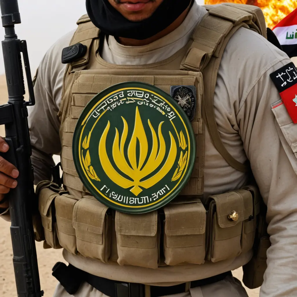 شعار جندي عراقي يمسك سلاح وخلفه نار ويوجد على خصر الجندي العراقي شارة تدافع عن الوطن بالإنجليزية