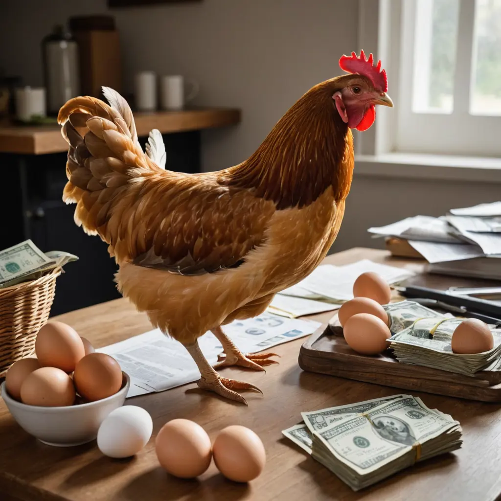 دجاجة تجلس على مكتب وتحمل اموال وعلى الطاولة يوجد أصناف من البيض
