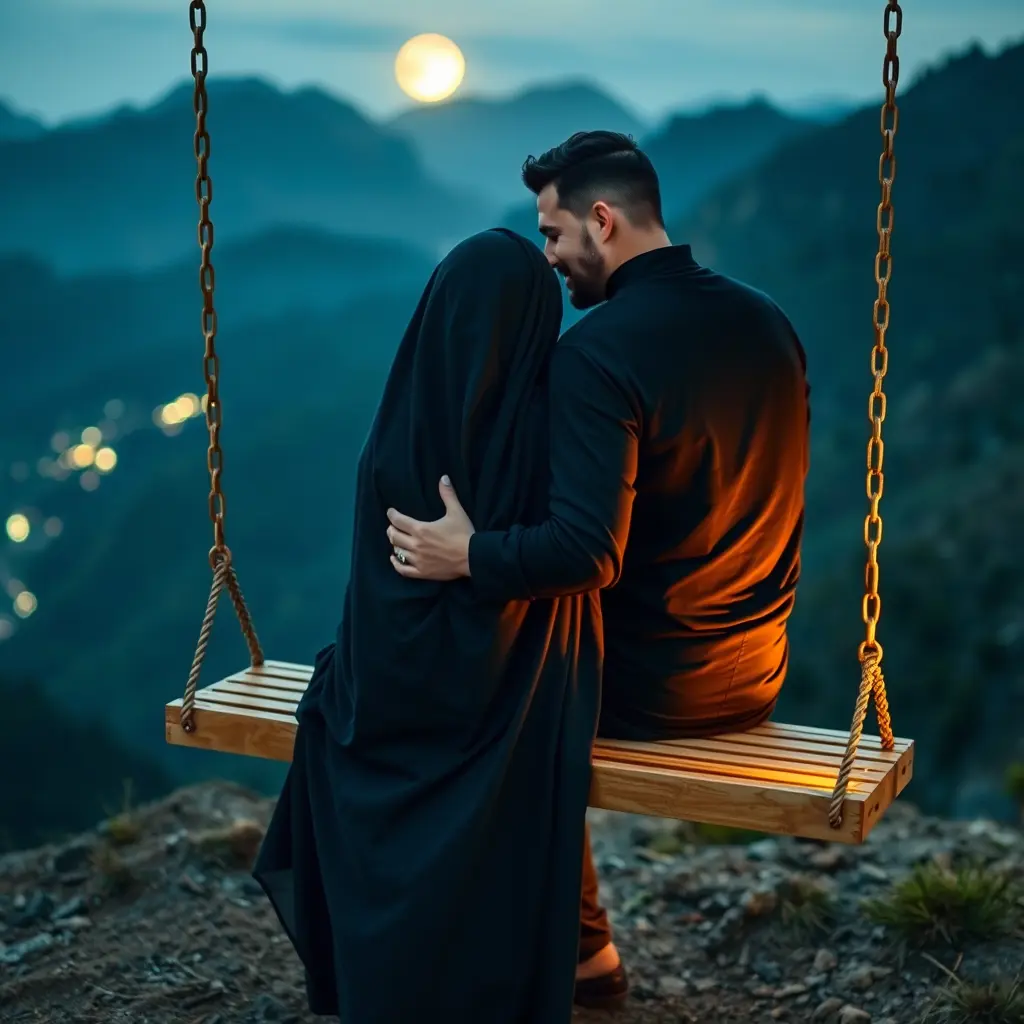 صورة رجل وبنت وألبنت لابسة عباية وعابطين بعض وجالسين على مرجوحة فوق جبل بليل بترميم ظهرن كا مشين إيدان بعض