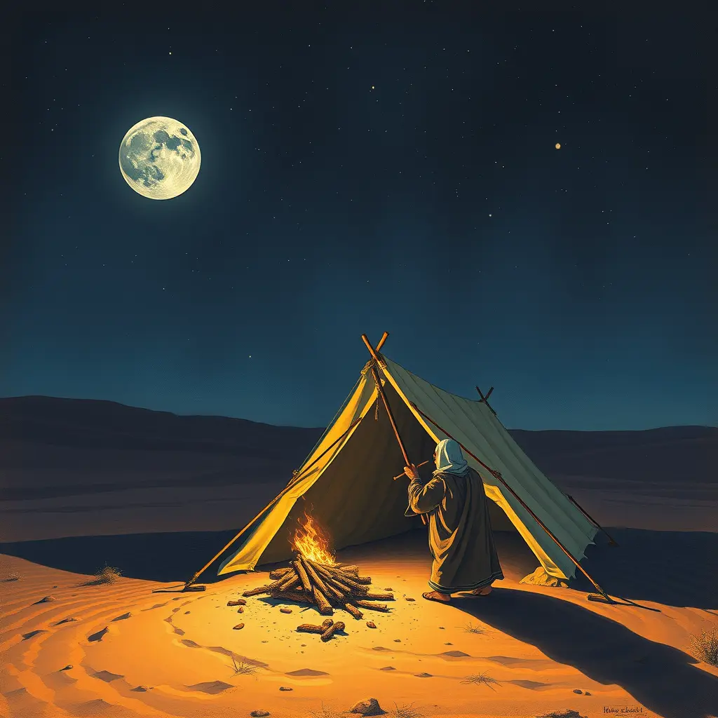 رسم خيمة في صحراء قاسية ليلا ورجل يذبح تاقة