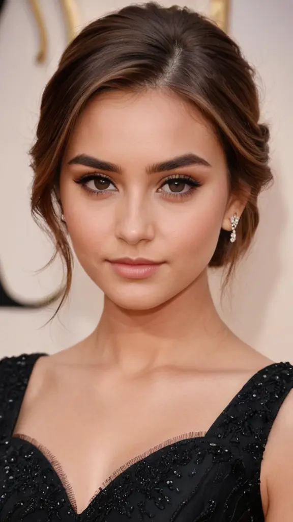 بنت حنطيه وعيونها كبيره عسليه ووجهها دائري غير مبتسمه ترتدي فستان فخم اسود وشعرها قصير ورقبتها متوسطة الطول ورموشها متوسطه الطول واذنها متوسطة الطول