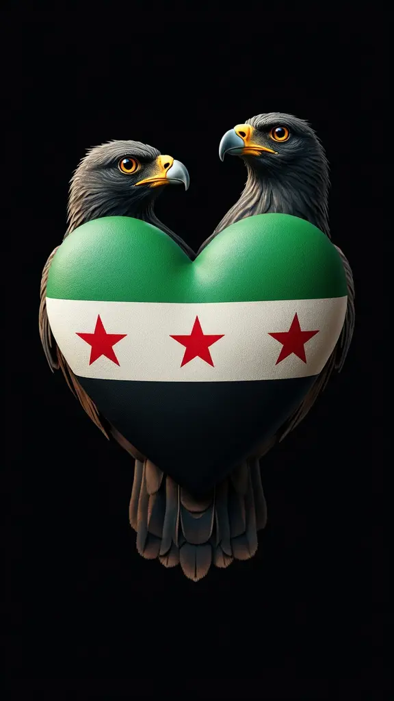 قلب على شكل نسر الشاهين عليه علم سوريا الجديد الذي الوانه من الاعلى اخضر ومن الاسفل اسود ومن المنتصف فراغ ابيض فيه ثلاث نجوم حمراء والخلفية داكنة