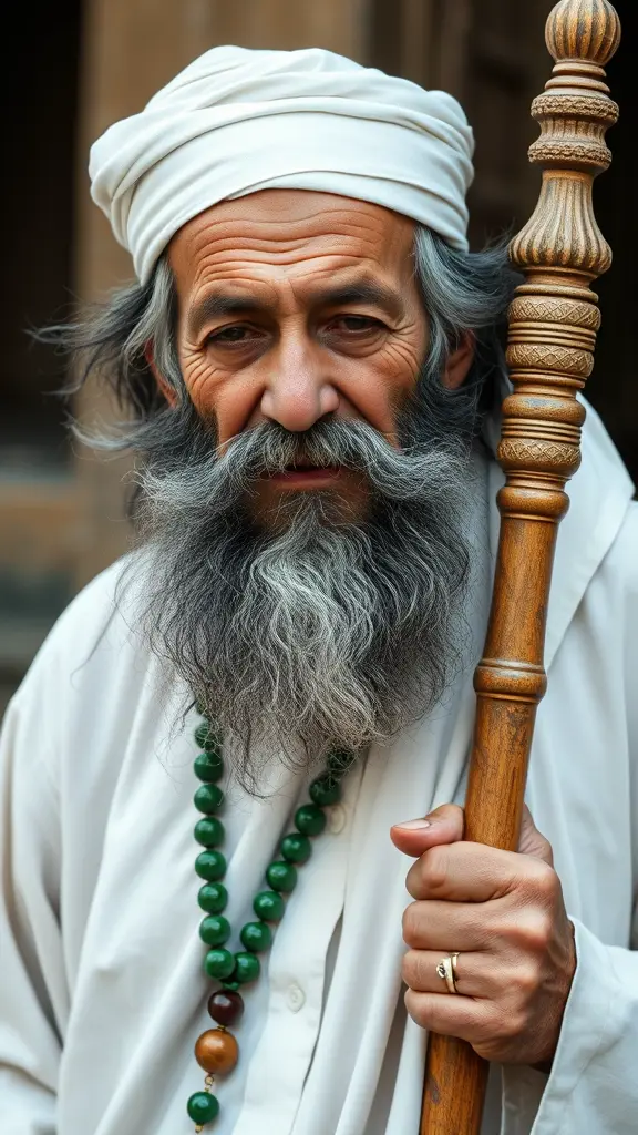 صورة رجل عجوز  صوفي متدين حكيم يحمل عصى عمره 120 عام لحية سوداء مع قليل بياض ويلبس خاتم ويضع سبحة خضراء في رقبته ولباسه ابيض