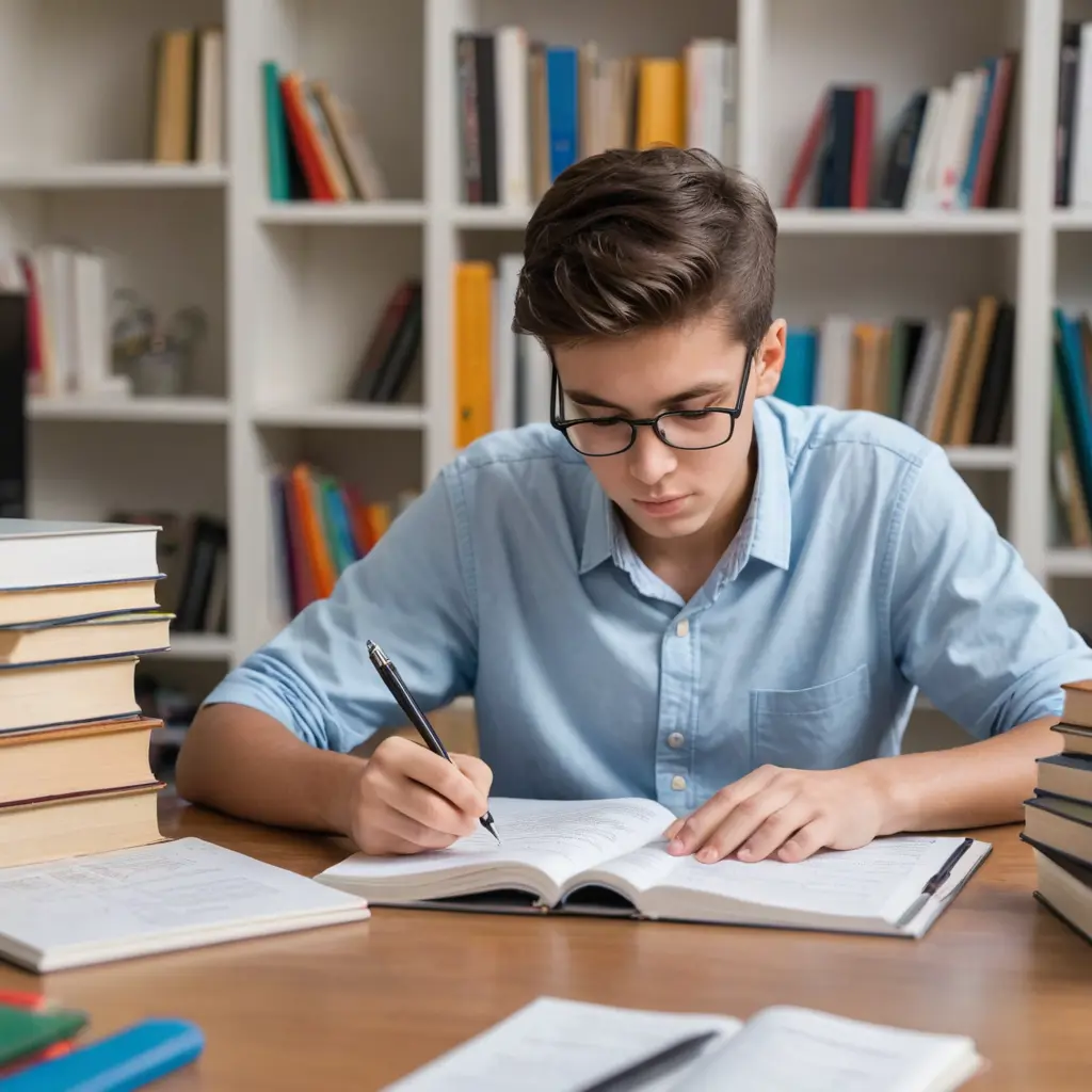 صورة تلميذ يذاكر دروسه معه اقلام وهو جالس على مكتب ومن حوله الكتب