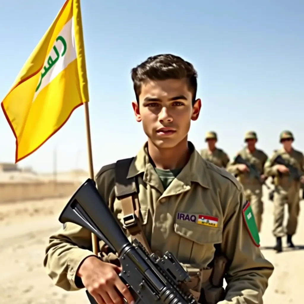 شاب عراقي جميل عمره 16 مرتدي زي عسكري وبيده سلاح بيده راية صفراء ومعه 4 جنود