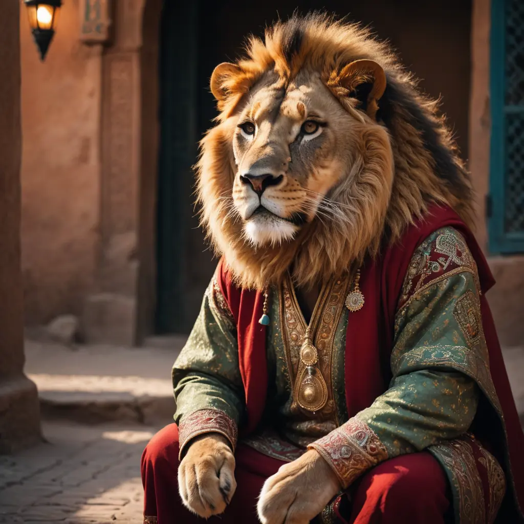 أسد يلبس لباس مغربي, مشهد سينمائي, دقة عالية,اضاءة عميقة