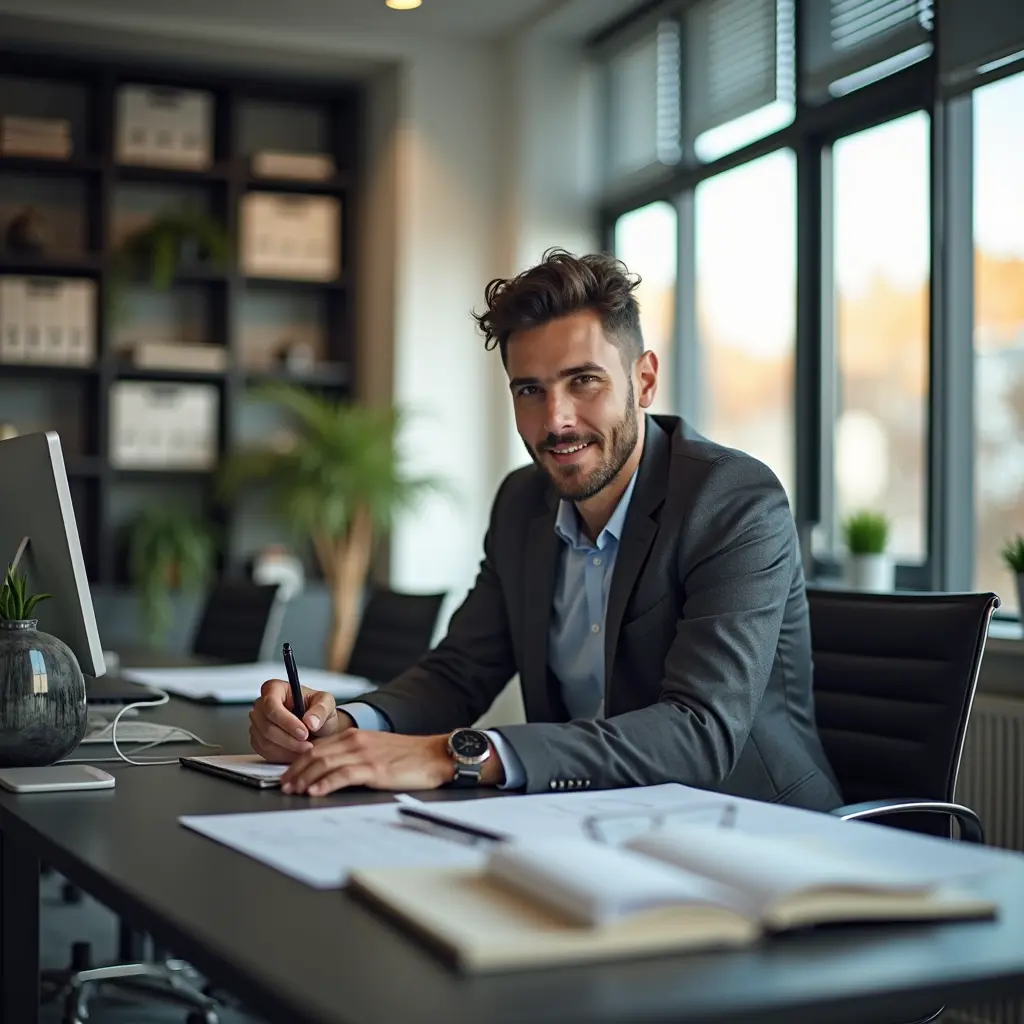 صورة تعبر عن شخص يعمل في مكتب خدمات محاسبية و دراسات جدوى اقتصادية و يظهر للعالم كم هو محترف و يظهر اهمية مكتبه
