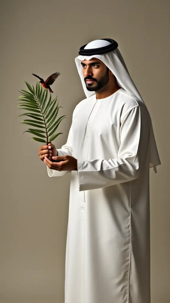 شخص يرتدي الزي الخليجي وعبائه عربيه، يحمل في اليد اليسرى كف يقف عليها طير