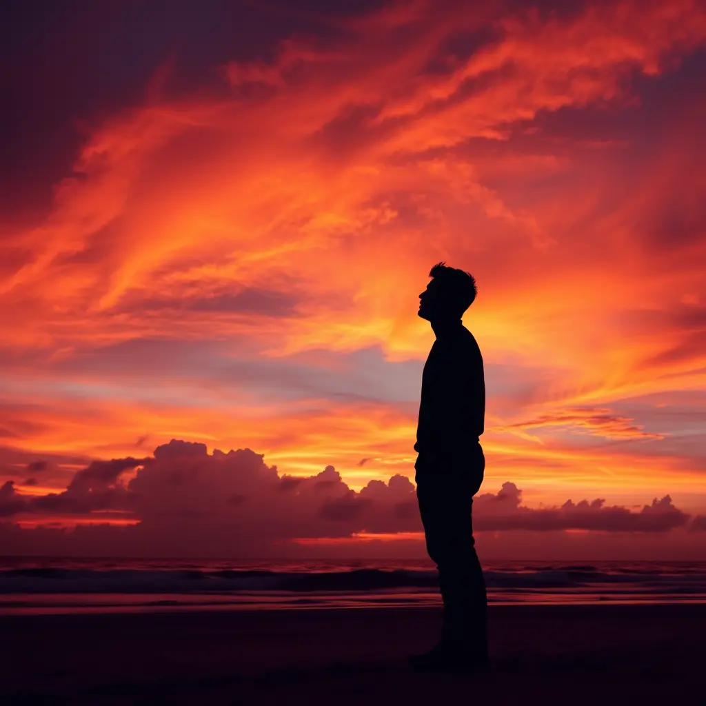 صورة ظلية لرجل عند غروب الشمس، سماء مثيرة، عدسة واسعة الزاوية، تباين عالي، برتقالي وأرجواني نابض بالحياة، إعداد الشاطئ