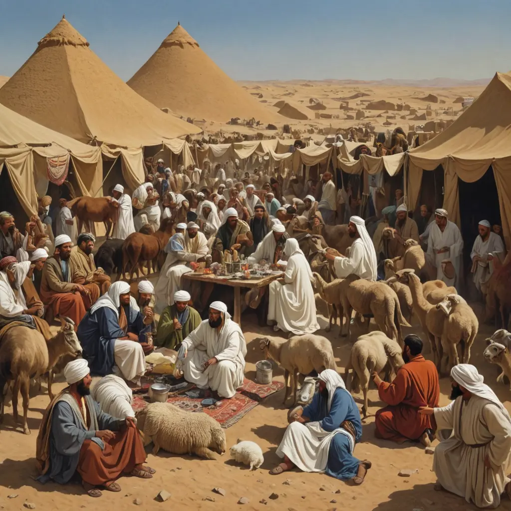 صورة تخيلية لكفار قريش فى الجاهلية يسكرون وحولهم الاصنام وغنم وجمال وخيم فى مشهد من التخلف والعبثية