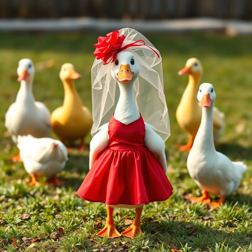 صورة بطة ترتدي فستان احمر تقف على العشب في يوم زفافها وخلفها اصدقائها البط محتفلين