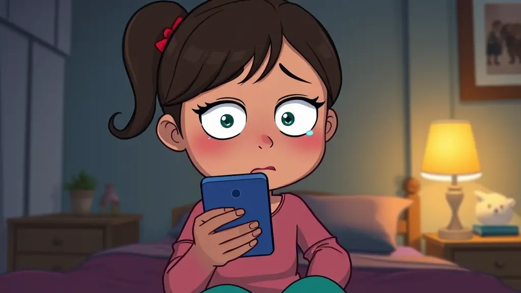 بنت حزينه كرتون ماسكه موبايل وعيونها فيها دموع داخل اوضة علي سريرها واضاءة ليلية