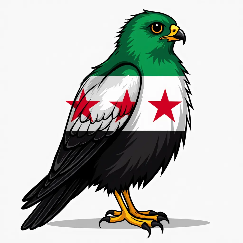 اصنع لي صورة طائر الشاهين مع علم الثورة السورية يبدو  العلم اخضر من الأعلى ابيض من المنتصف اسود من الاسفل 3 نجمات باللون الأحمر في المنتصف بدقه عالية