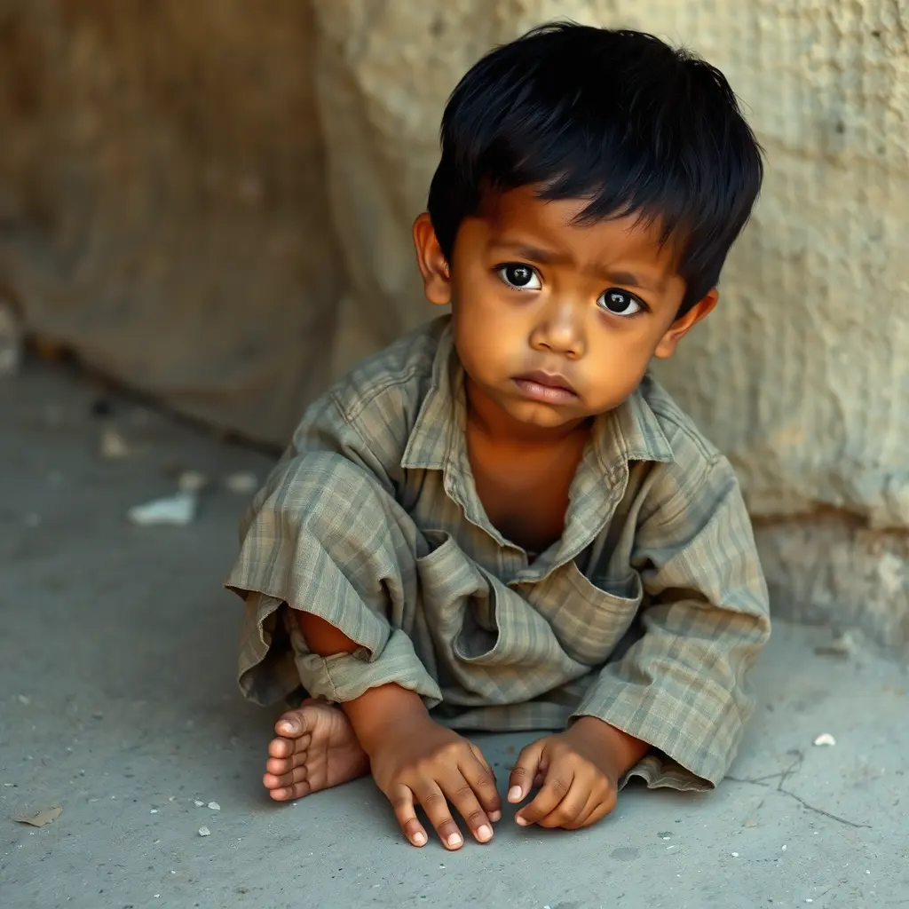 ولد عمرة 5 سنوات فقير ملابسة ممزقة جالس على الارض حزين لون شعرة اسود لون العين اسود