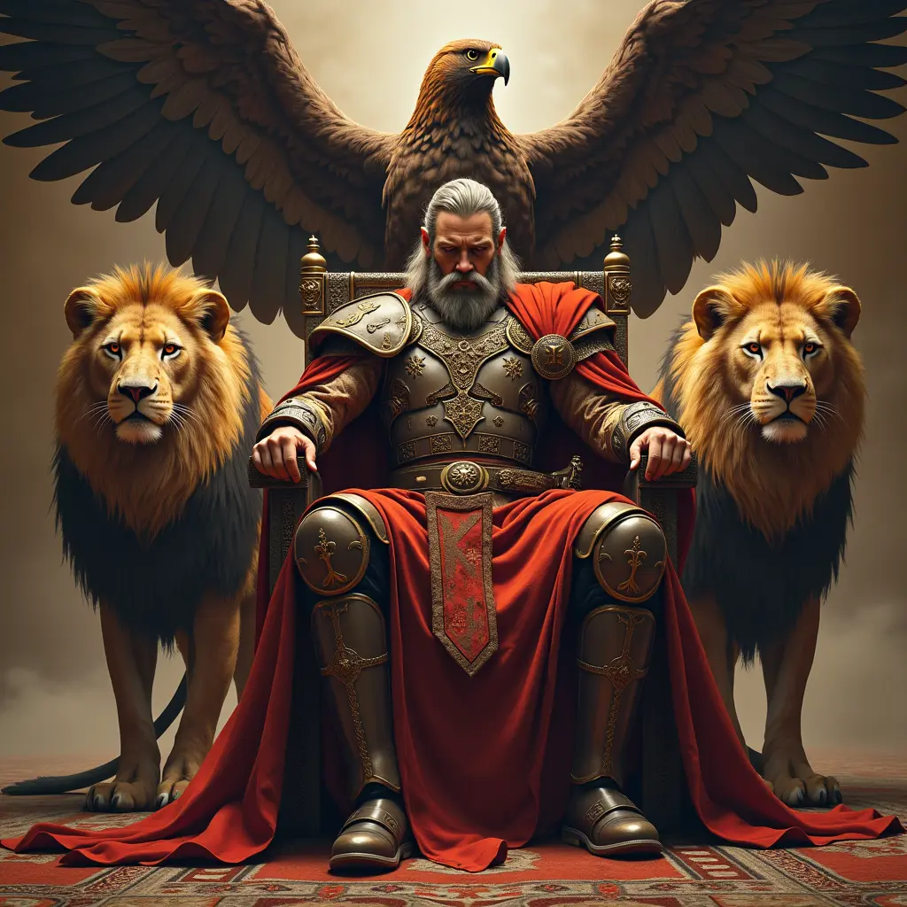 صورة ملك محارب يجلس على العرش وحوله أسدين وخلفه نسر