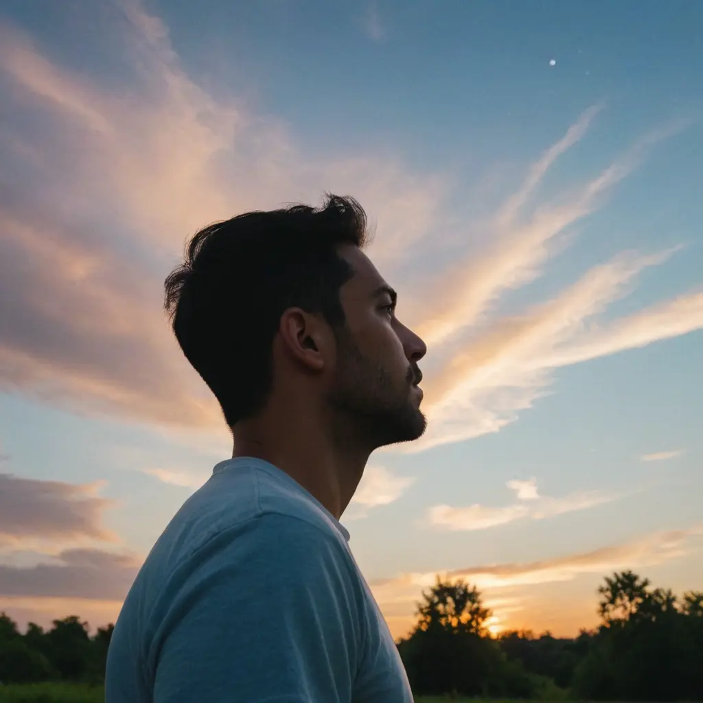 رجل ينظر الى سماء جميلة الرجل ينظر باتجاه السماء