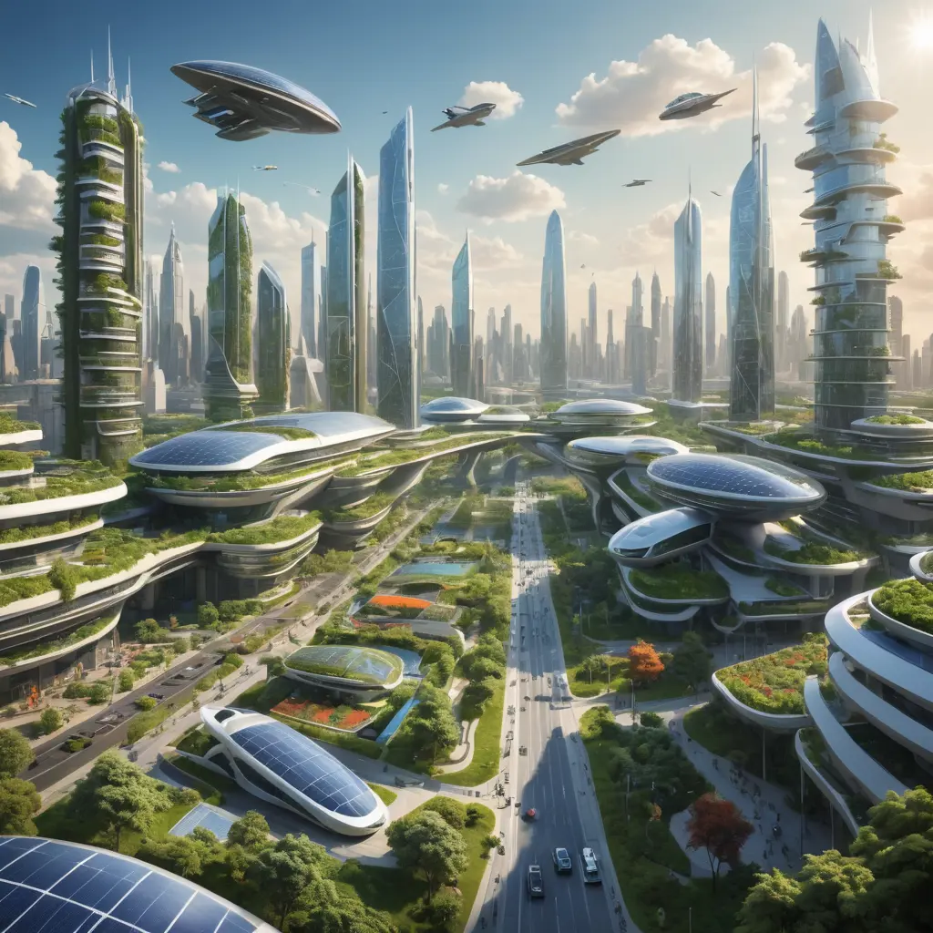 رسمه فنيه عن مدينه المستقبل تكون بسيطه وسهله بها حدائق ومباني عاليه وطاقه شمسيه وطائرات وسيارات