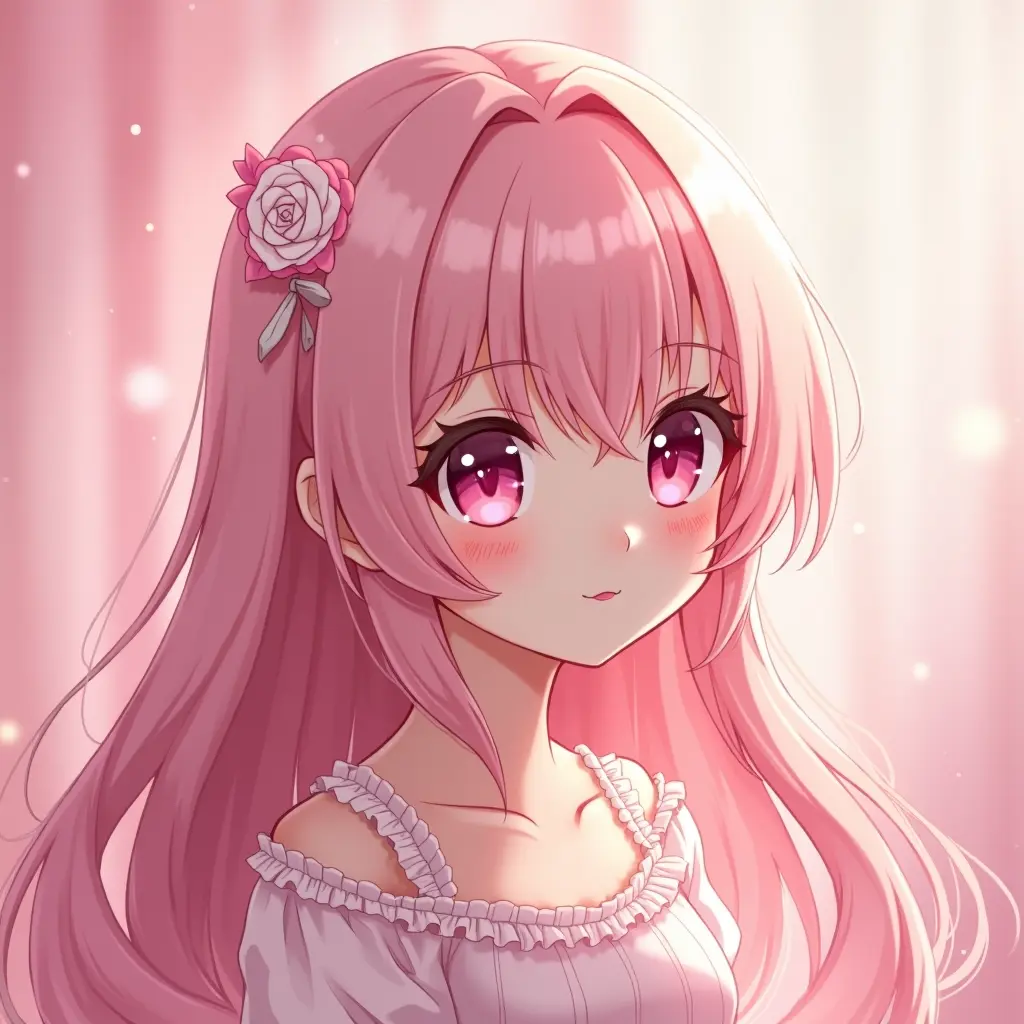cute cartoon girl avatar, dreamy pink aesthetic, soft glowing background, pastel colors, big shiny eyes, elegant hair with pink tones, gentle smile, magical atmosphere, detailed anime style, perfect profile picture, charming and eye-catching