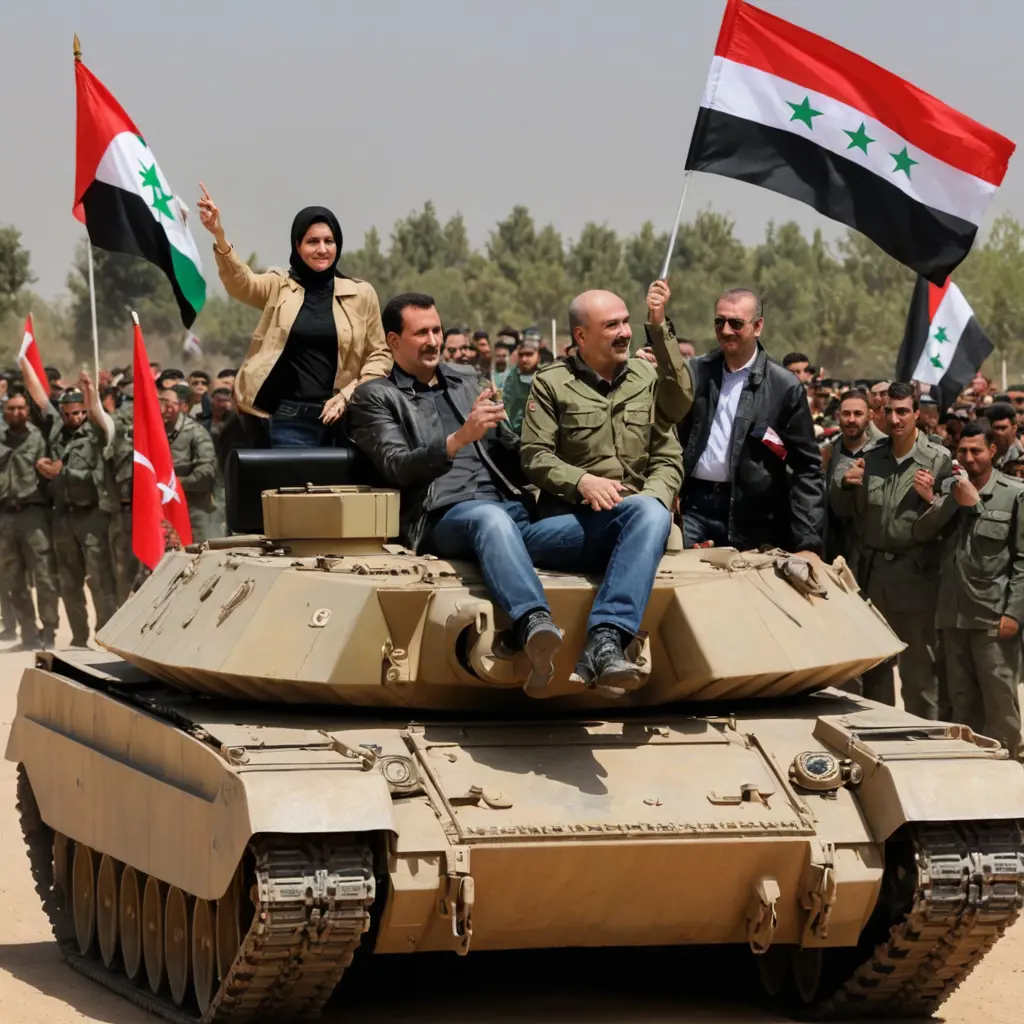 بشار الأسد يقود دبابة وجانبه زوجته أسماء وهما يحملان العلم السوري وبجانبه حسن نصر الله