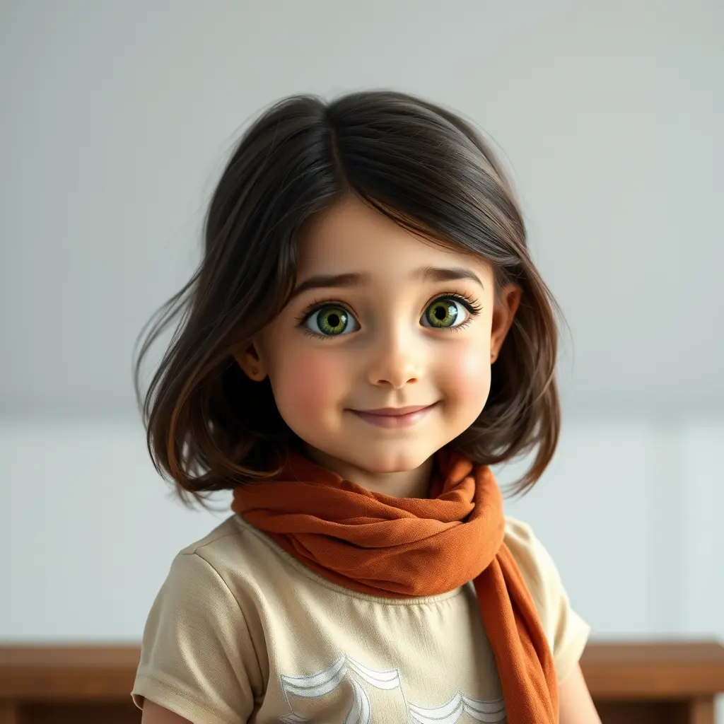 بنت شعرها بني غامق بشره قمحية فاتحة وعيونها أخضر غامق عند مكتب لونه بني غامق وتبتسم وتقول انا رهف وتكون مصرية