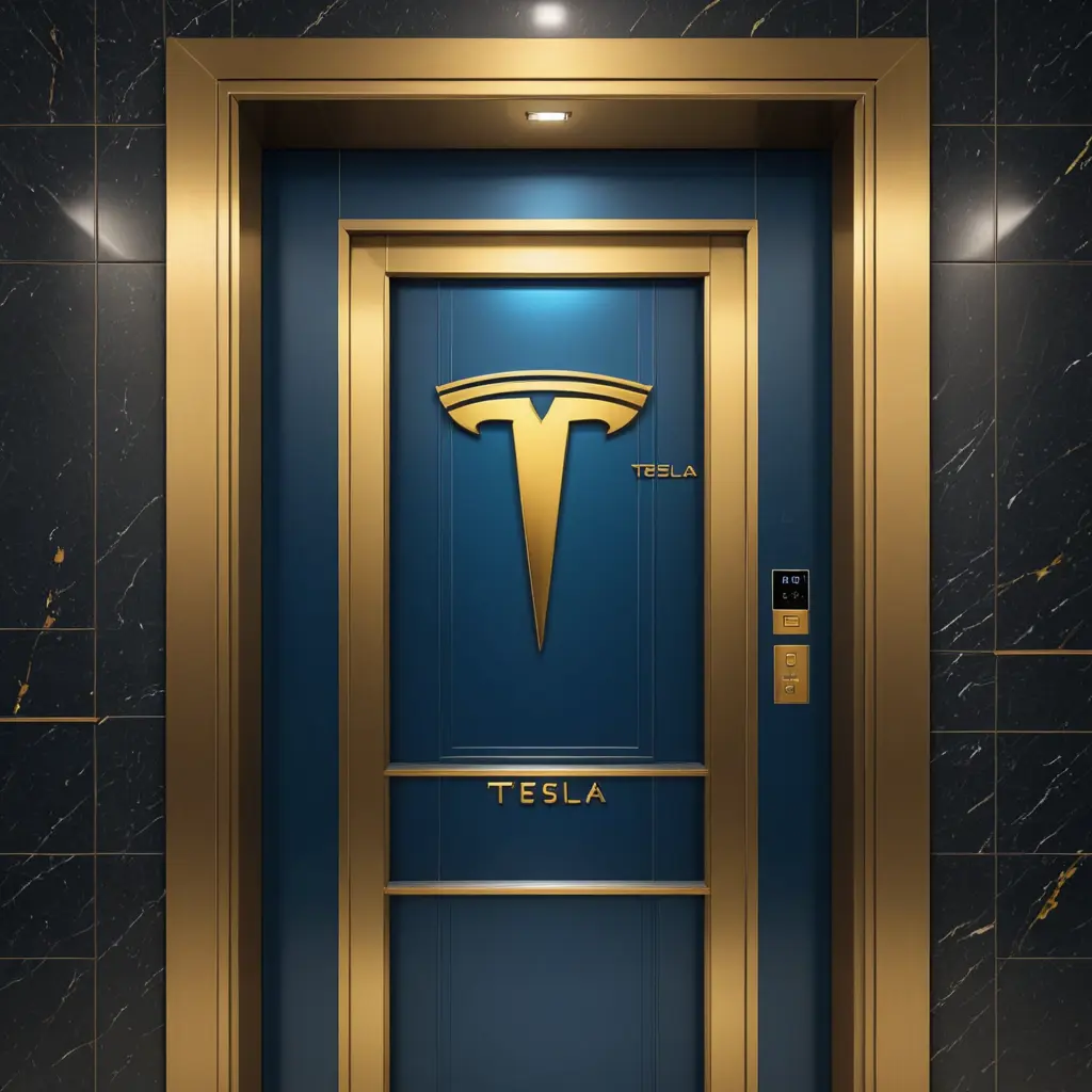 تصميم لوغو لشركة مصاعد اسمها تيسلا مع استخدام الون الذهبي والأزرق مع اظهار داخل المصعد