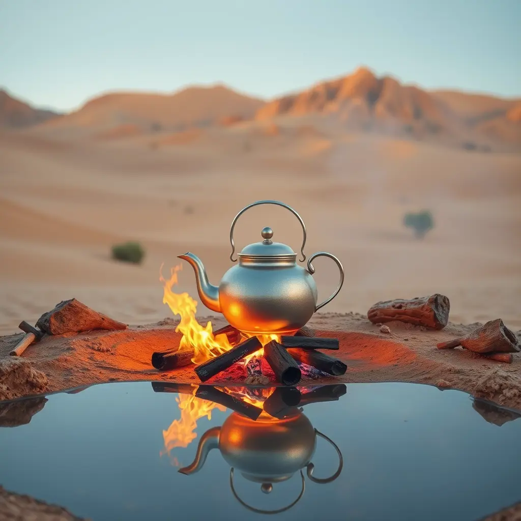 ابريق شاي فوق نار في صحراء مع وجود واحات و بركة مائية