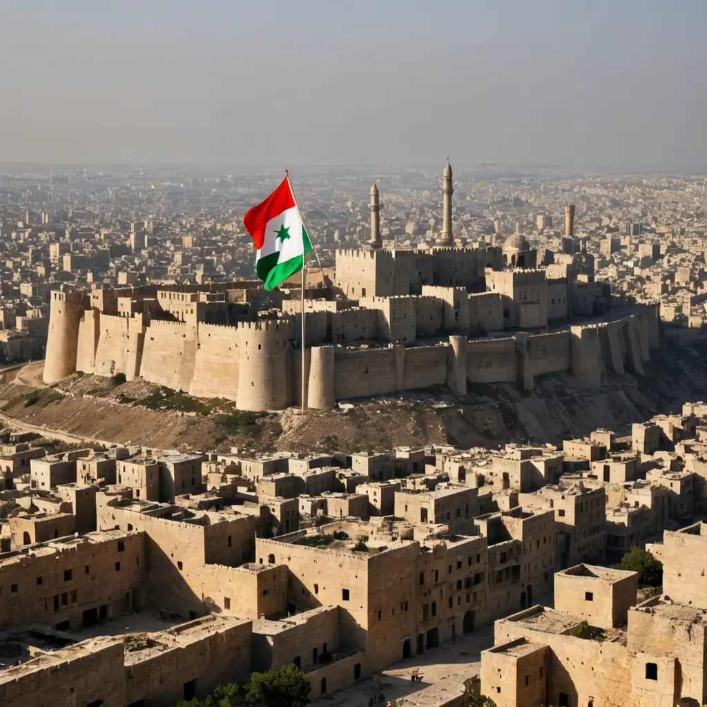 بدي صورة لقلعة حلب مع علم سوريا الجديد وتكون الوان ااصورة مايلة للبرتقالي تقريبا وبدقة عالية وبحيث يكون العلم شفاف شوي على كامل الصورة