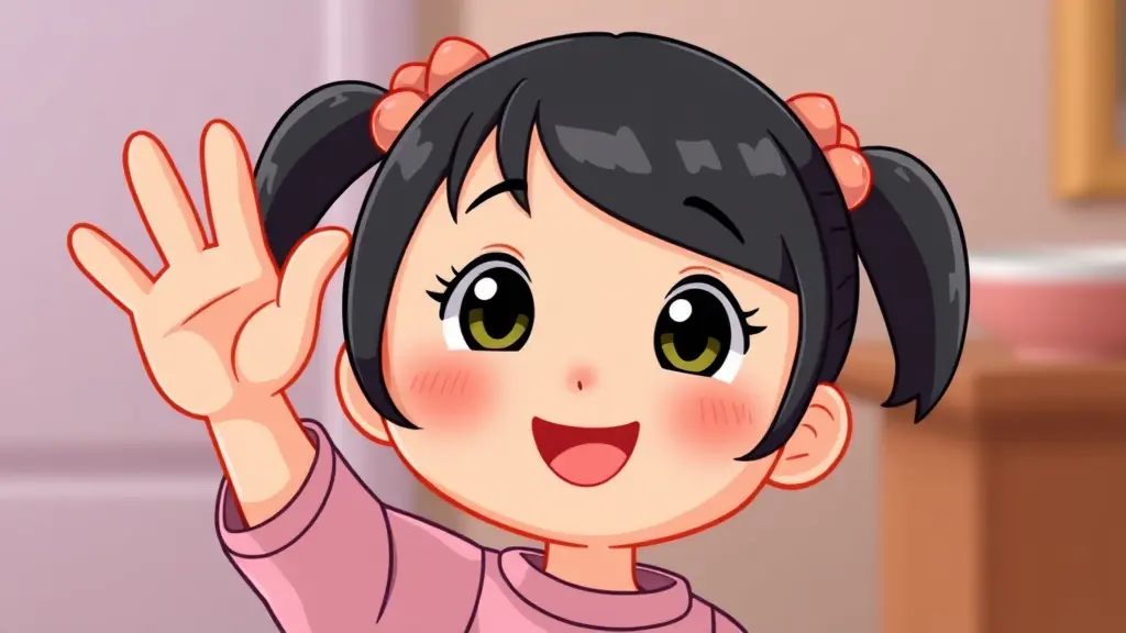 شخصية كارتونية.. بنت طفلة.. وشعرها خصلتين.. وتكون مبتسمة.. ورافعة يدها اليمى للترحيب.. وعندها فم