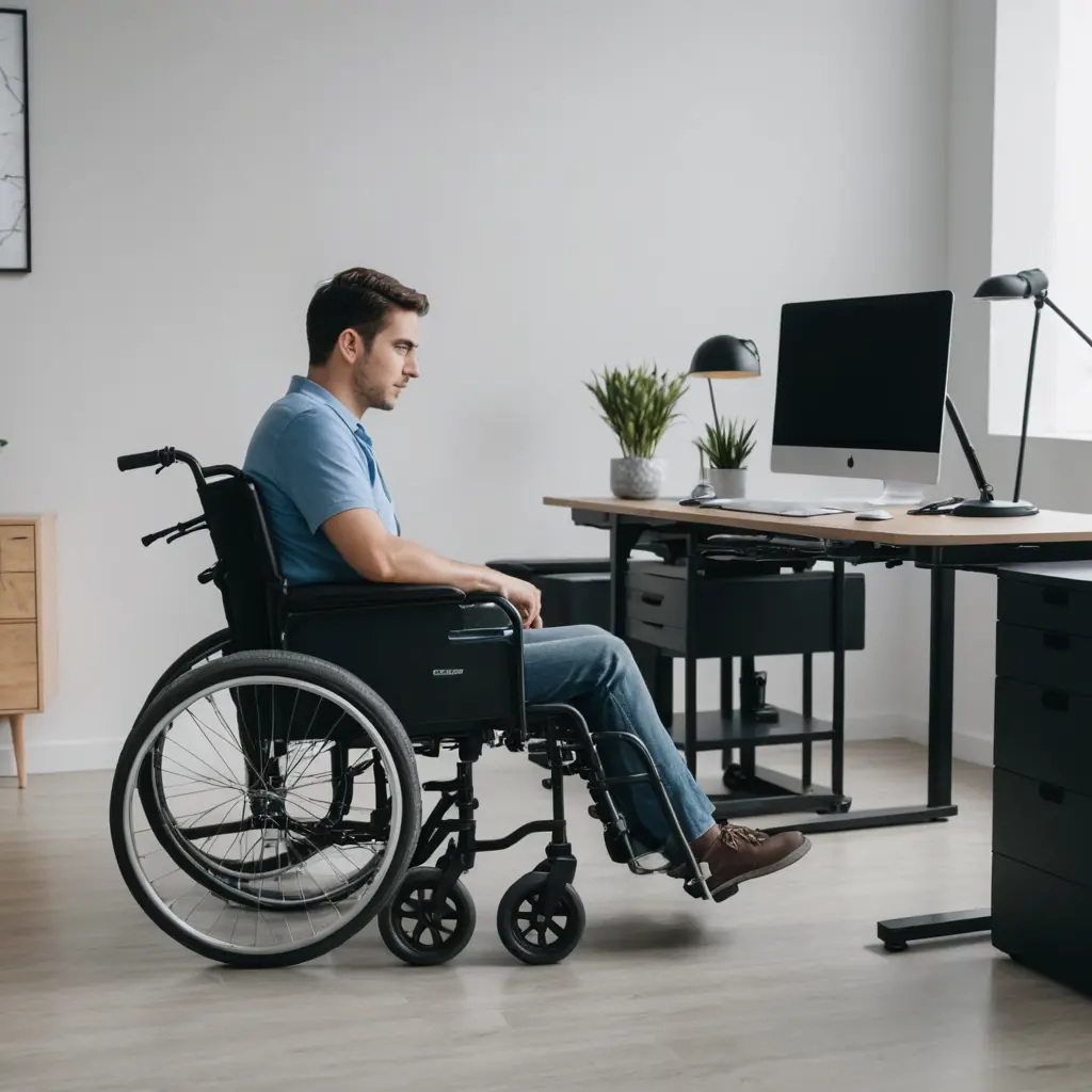 شخص قاعد على كرسي متحرك امام المكتب الكومبيوتر