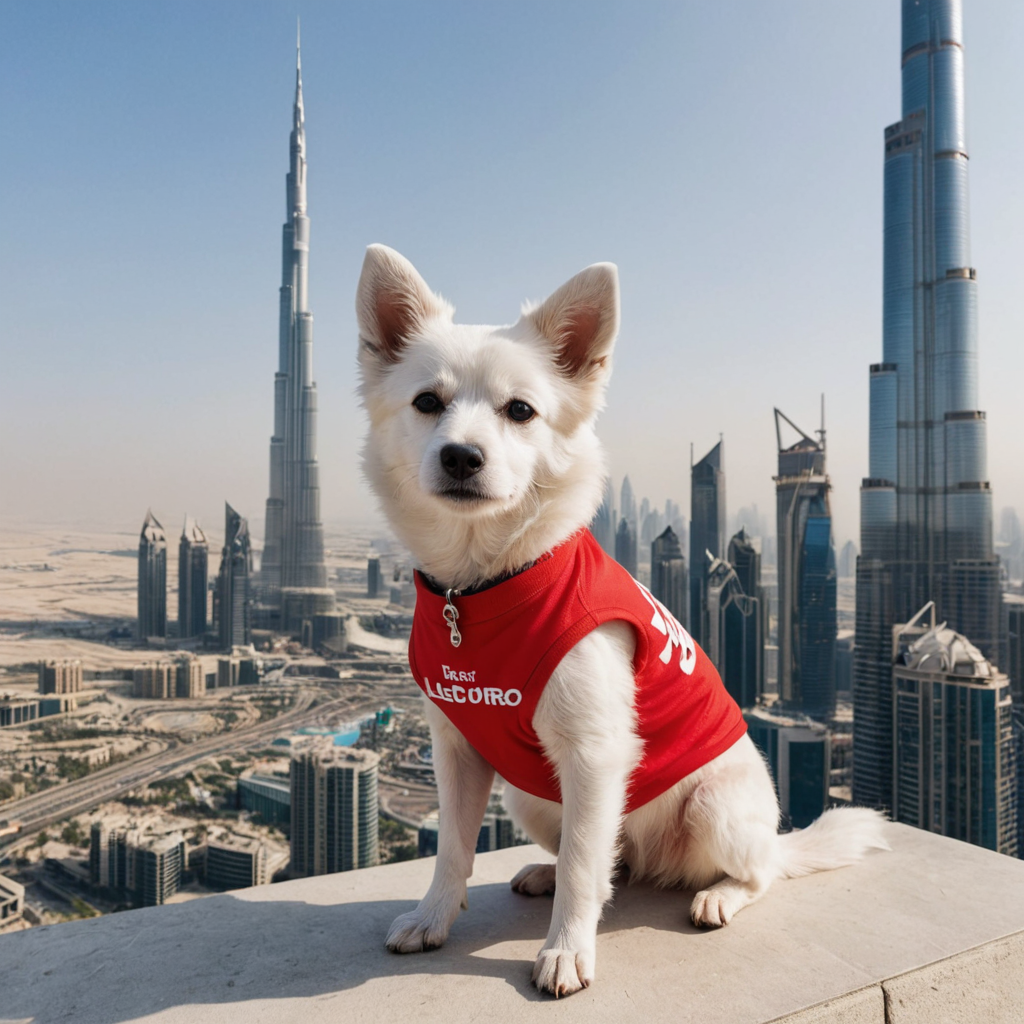 كلب لولو فوكس ابيض فقط صغير  اذنه متدلية نحو الاسفل يرتدي ملابس حمراء مكتوب عليها leo و خلفه برج خليفة
