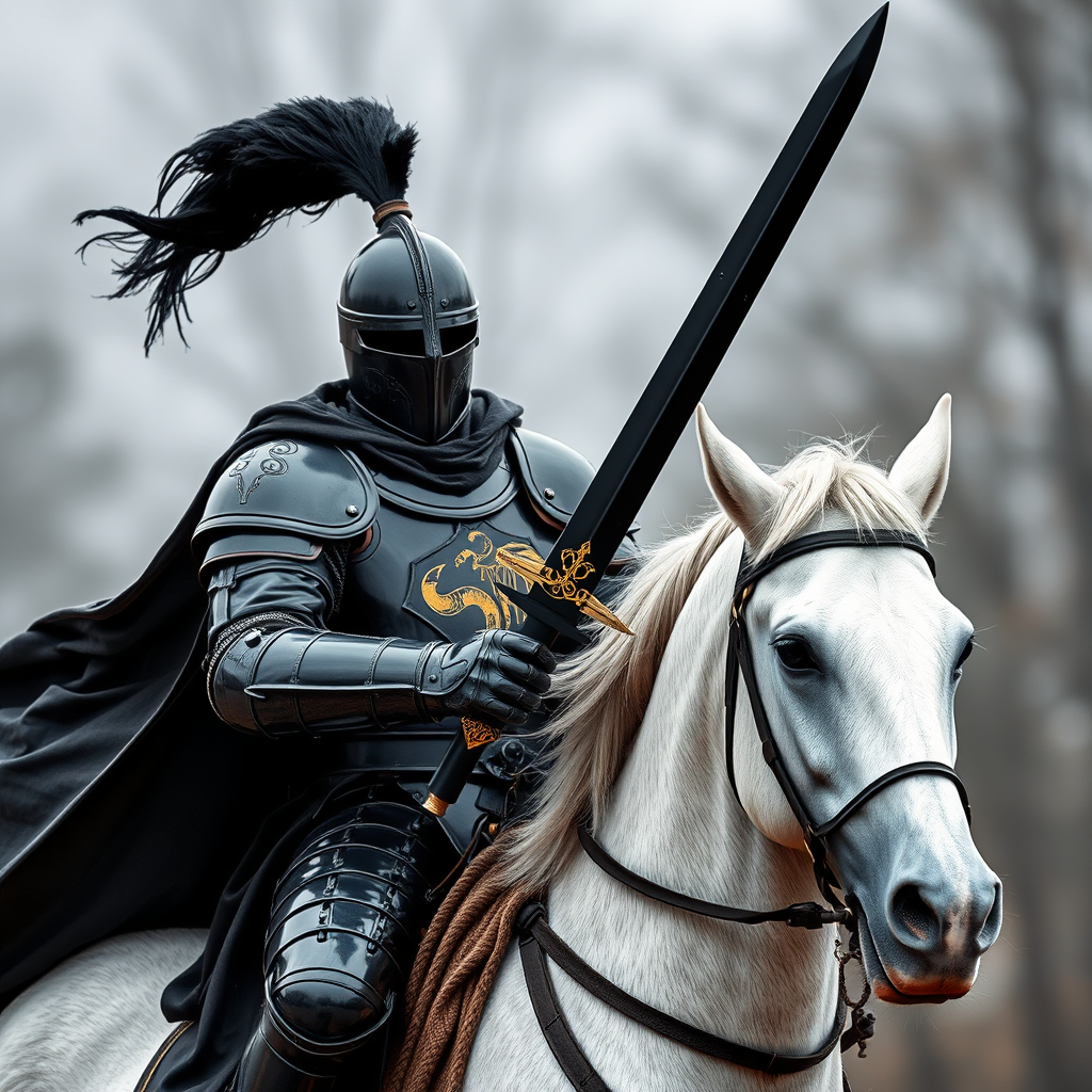 صوره لفارس يرتدي درع اسود وسيفه اسود به نقش باللون الذهبي ويركب حصان ابيض