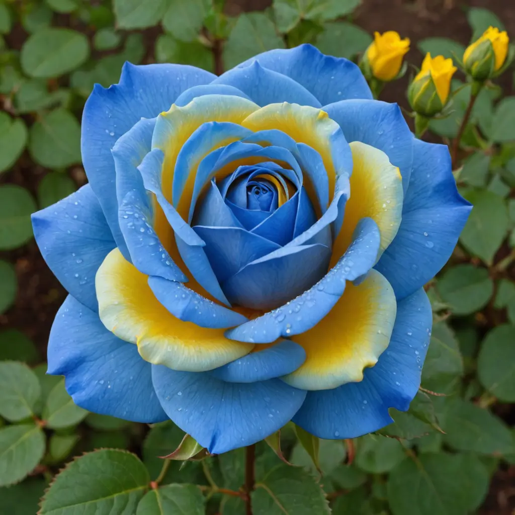 وردة زرقاء كبيرة وحولها ازهار صفراء صغيرة