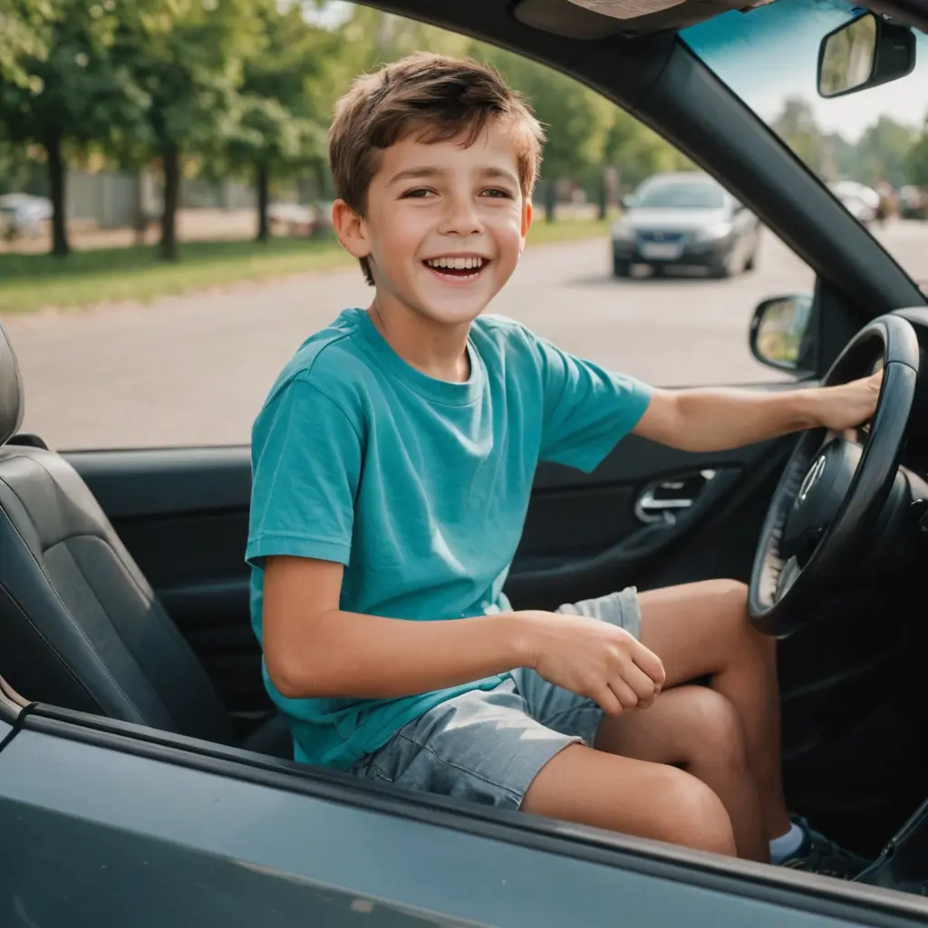 ولد يركب سياره وهو سعيد